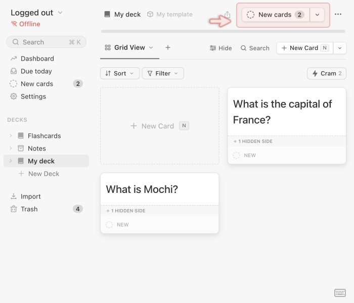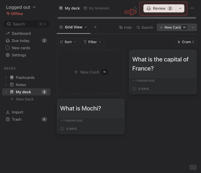 Now that you’ve created a few cards, it’s time to learn and review them. Mochi uses spaced repetition to help you remember information efficiently over time. Instead of showing you everything every day, it schedules each card at increasing intervals based on how well you remember it.