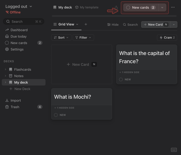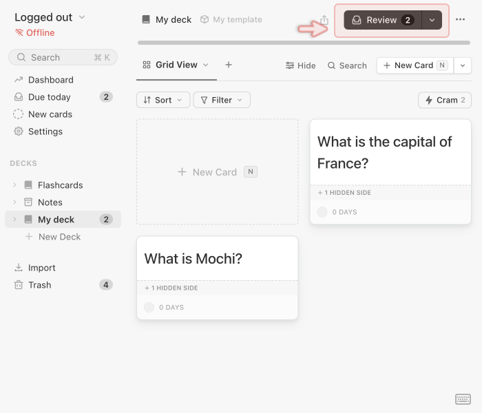 Now that you’ve created a few cards, it’s time to learn and review them. Mochi uses spaced repetition to help you remember information efficiently over time. Instead of showing you everything every day, it schedules each card at increasing intervals based on how well you remember it.
